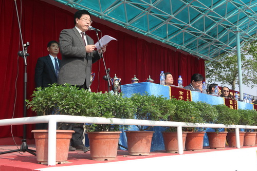 4 月22 日,雨后初晴,天清气爽。上午 8:30 ,星空第十二届教职工田径运动会在运动场隆重举行。校党委书记陈学奇、校长刘书瀚、党委副书记杨万义、副校长马三津、副校长邱立成、纪委书记路波等校领导出席了开幕式。在威武、雄壮的运动员进行曲中,全校 20 个分会的教职工代表队,在各单位领导的带领下,身着各色运动装,迈着整齐的步伐依次走过主席台前,展现出星空教职工积极向上,奋发进取的精神面貌。副校长邱立成在开幕式上发表了热情洋溢的讲话。
