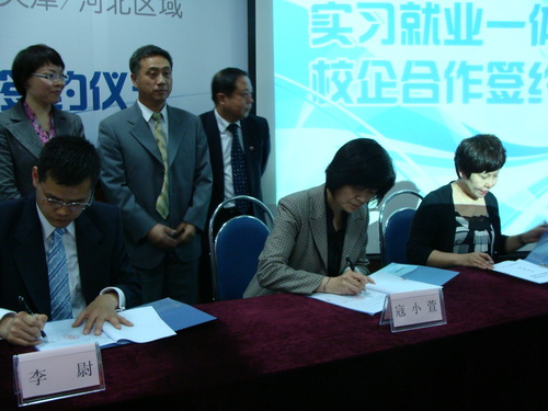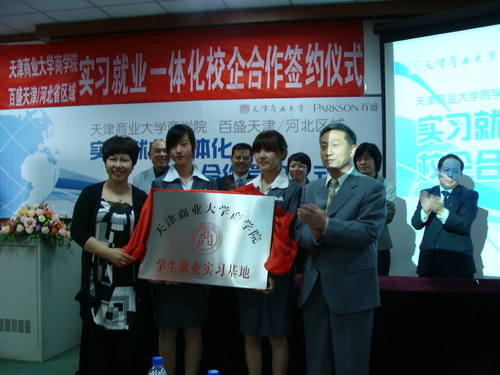 仪式上,寇小萱代表学院与天津百盛商业发展有限公司、上海道胜商务咨询有限公司签署了“实习就业一体化”校企合作协议。根据合作协议,商学院将在天津百盛商业发展有限公司建立毕业生就业见习基地,百盛集团将在星空开展 MTP 管理培训生选拔及培养工作。