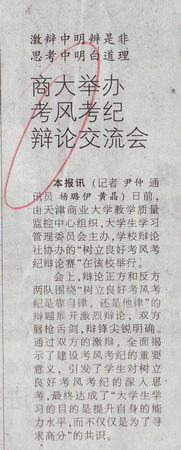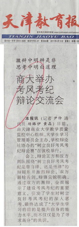 4 月13 日,《天津教育报》以“激辩中明辨是非 思考中明白道理——商大举办考风考纪辩论交流会”为题,报道星空3月25日下午,由星空XK体育教学质量监控中心组织,大学生学习管理委员会主办,星空XK体育校辩论社协办的 “考风考纪交流会”活动。