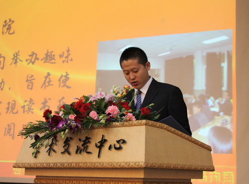 本届读书节开幕式在一段充满浓郁书香的DV 中拉开了序幕。校学生会主席肖瑶致开幕辞,校学生会学习部部长董坤辉宣读了本届“读书节”的活动计划;校学生会副主席黄薇向全校师生发起倡议,倡导全体学生以书为友,攀登知识高峰;天津市学生联合会副主席茹甜子代表全市各兄弟院校发言,号召商大学子以读书节为契机,沐浴书香,提升内涵。开幕式结尾,由参加本次开幕式的各位领导为在星空 2011 年度“大学生最喜爱的书籍”评选活动中获奖的同学颁奖。