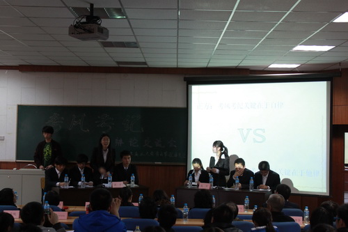 会上,主持人首先介绍了大学生学习管理委员会的职能,对开展此次活动的意义和目的进行了说明。校辩论队围绕 “树立良好考风考纪是靠自律还是他律”展 开激烈辩论,通过正反方的辩论,深刻道出了学生和老师对于树立良好考风考纪的心声,引起大家对于树立良好考风考纪的深思,从而引出了大家关于大学生学习的目的是提升自身的能力水平还是仅仅寻求高分的思考。