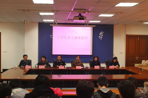为更好地帮助在校大学生了解自主创业方面的相关知识,为大学生自主就业提供更为有效的指导和服务,公共管理学院于2011年3月22日下午在图书馆二楼会议室举办了“大学生自主就业指导”讲座。本次讲座邀请了工商红桥分局李强局长及注册科的隋东科长、陈玉忠科长和靳娜科长担任主讲,公共管理学院党委白洪文书记、刘均玲副书记出席了本次讲座,我院在红桥区行政许可中心挂职的闫乃权老师全程参与,近 80 名同学参加了讲座。讲座由辅导员孙瑶老师主持。