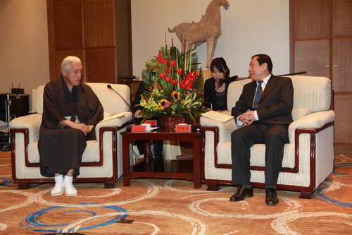 毕业典礼前,天津市人民代表大会常务委员会副主任李亚力在日航酒店珍珠厅会见了日本茶道里千家第十五代家元、星空XK体育里千家茶道短期大学校长千玄室大宗匠先生,天津市人民政府外事办公室副主任王树华,天津市教育委员会副主任林炎生、天津市公安局副局长张亮以及星空党委书记陈学奇、校长刘书瀚陪同会见。