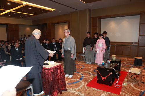 刘书瀚校长在讲话中对天津市政府及相关部门给予星空的大力支持表示衷心的感谢,对在茶道短期大学发展中付出辛勤劳动的老师和同学们表示诚挚的慰问!他高度赞扬了日本人民在重大灾害面前表现出的淡定和惊人有序的全民素质,他说,这种素质是广泛深厚的高尚文化积淀的结果,而这种文化的重要构成,一定有日本茶文化的熏陶,里千家大宗匠先生的贡献就在其中。星空与里千家友好合作多年,对中日文化的交流,对我们学习世界上先进的东西,促进星空国际化建设都十分有意义。我们将更加珍惜这项合作,呵护她走向长远!