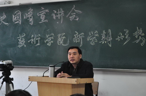 3月16日下午,艺术学院2011年新学期形势与政策教育第一课报告会在3教404教室顺利进行,学院党总支书记张建东对全院近百名学生党员和入党积极分子进行了形势政策的专题辅导,报告会由院团委书记韩志文主持。