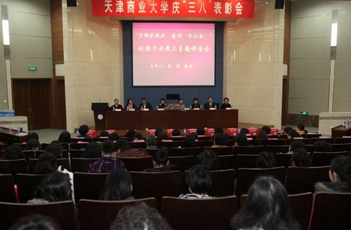 会上校工会女工委员会主任卫弘宣读了《关于表彰2009—2010年度天津商业大“三八”红旗手的决定》,并祝贺星空马克思主义学院获天津市三八红旗集体荣誉称号。在悠扬的乐曲声中与会领导为受表彰集体和个人颁发奖牌和荣誉证书。获奖代表马克思主义学院张敏教授在会上发言。