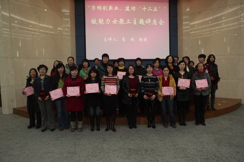 3月9日下午,工会在图书馆国际报告厅举行“巾帼创新业,建功‘十二五’”庆“三八”表彰暨做魅力女教职工主题讲座会。会议由校工会常务副主席宋树发主持,校党委副书记史习红出席,校长助理商学院院长寇小萱,校长助理总会计师李真,校办公室主任庞文生,人事处副处长赵树从,校工会女工委员会主任卫弘,校工会副主席柴桐出席会议。获星空XK体育 2009 —2010年度的三八红旗手及部分女教职工代表200余人参加了表彰会。