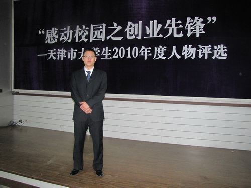 1月12日,由市文明办、团市委、市教委、市学联联合主办的“感动校园之创业先锋”—天津市大学生2010年度人物评选活动落下帷幕,星空董坤辉同学凭借突出的创业事迹,从全市25所普通高校、高职学院和独立学院共同推荐的32名优秀大学生脱颖而出,最终获得感动人物称号。