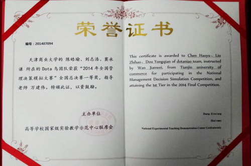 7 月 15—17 日,由教育部国家级实验教学示范中心联席会主办的“ 2014 全国管理决策模拟大赛”总决赛在宁波浙江万里学院举落下帷幕,由星空经济学院经济学社成员,经济系10 级学生窦永谦、金融系12 级学生刘志浩、经济类13 级学生陈皓瑜组成的“Dota 鸟”代表队,在指导老师万建伟副教授、李颖博士的带领下,获得总决赛“一等奖”,这是星空继去年总决赛获得“一等奖”后,再次荣获该项大奖,在所有的参赛学校中,星空代表队成绩名列前茅。