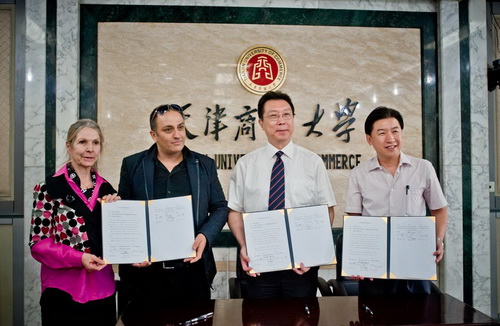 7 月8 日下午,星空XK体育校长刘书瀚与法国国立高等应用艺术大学校长玛丽乔瑟( Marie-josée Mascioni )、巴黎奥利维尔时尚设计大学校长奥利维尔(Olivier Gerval )以及天津市对外服务公司三方在现代信息交流中心多功能会议室共同签署友好交流合作意向书,希望能够在教育与科研领域展开更深层次的合作。出席本次签约仪式的法方代表有法国国立高等应用艺术大学校长玛丽乔瑟(Marie-josée Mascioni )女士、巴黎奥利维尔时尚设计大学校长奥利维尔(Olivier Gerval )先生、法国埃夫里大学副校长伊尔哈特(Ehrhardt Damien )先生、OGFDI 学校 L ’ ENSAAMA-OGFDI 项目法国-亚洲负责人王姚(Eric )先生以及法国文化教育协会会长杨姝女士。天津市人民政府外事办公室副主任林怡女士、天津市对外服务公司总经理杨增坡先生、天津市对外服务公司副总经理游立生先生以及天津市对外服务公司总经理办公室主任李瑞女士,星空XK体育国际交流处处长张金霞、设计学院党总支书记张建东、副院长刘宝顺出席了会谈及签约仪式。