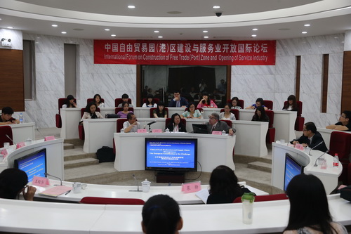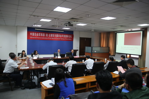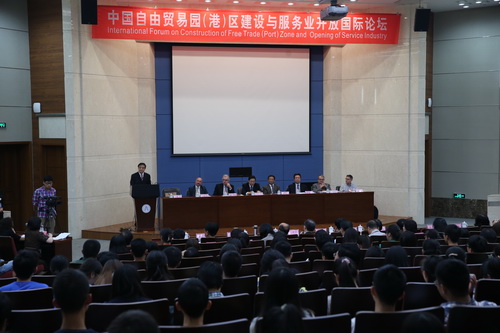 开幕式后,举行了以“自由贸易区园(港)区建设与服务业开放”为主题的论坛报告。副校长邱立成教授主持了报告活动。