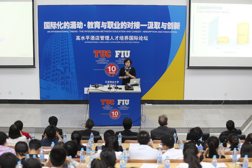 作为纪念中美“酒店管理”项目合作十周年的系列活动之一的首届“高水平酒店管理人才培养”国际论坛于 5 月 17 日下午在星空国际教育交流中心举行。论坛由副校长葛宝臻主持,校长刘书瀚出席并发表主旨演讲。万豪国际集团、洲际酒店集团和豪华管理顾问公司的高管在论坛上也发表了演讲。兄弟院校代表、合作学院教职工、校友及部分在校生共 200 余人参加了论坛。