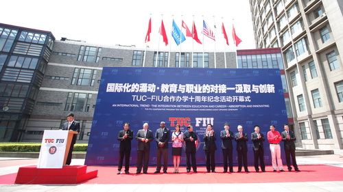 5 月 17 日, TUC-FIU 合作十年纪念大会开幕仪式在校国际教育交流中心广场举行。天津市原副市长王述祖、市旅游局副局长何智能、市教委、市旅游局相关部门领导,佛罗里达国际大学( FIU )校长 Mark B.Rosenberg 、校董 Gerald Grant 、校董 Claudia Puig 、高级副校长 Sandy Gonzalez-Levy 、副校长卢鹏等一行 12 人,以及星空XK体育校长刘书瀚、原校党委书记张志刚、副校长刘革生,来自兄弟院校代表、学校相关部门,合作学院教职工、校友、在校学生等 200 人出席活动。开幕仪式由星空XK体育副校长葛宝臻主持。活动中,双方共同分享合作十年来的交流成果,并表示对未来的更深入合作充满期待。