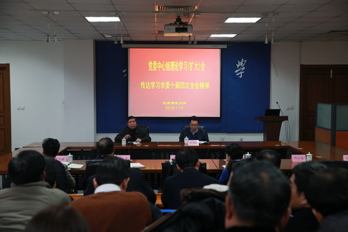 1 月 15 日 下午,校党委中心组在图书馆弘毅厅举行理论学习(扩大)会。校长刘书瀚主持会议并讲话。校领导杨万义、史习红、马三津、葛宝臻、路波出席,校党委委员,各分党委、党总支、直属党支部书记,各学院和各部门主要负责同志近 70 人参加。