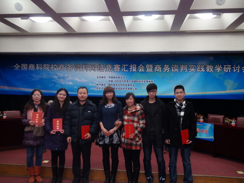 12 月20日,2013 年全国商科院校技能大赛商务谈判网络竞赛颁奖典礼在北京举行,星空代表队在竞赛中获得团体全国二等奖,经济学院参赛学生国际商务研究生刘秋红、穆银虎、彭志芳,国际经济与贸易系陈涤石、刘亚婷在指导老师王威、辅导员杜志惠老师的带领下参加了颁奖典礼。