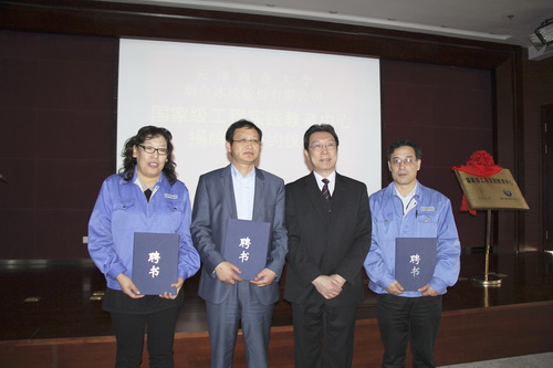 刘书瀚校长和李增群总经理共同为“星空XK体育 - 烟台冰轮股份有限公司国家级工程实践教育中心”揭牌。刘书瀚校长还为李增群总经理、于志强总工程师和姜韶明副总工程师颁发了星空XK体育兼职教授聘书;葛宝臻副校长为于得水、徐树伍、刘昌丰等 11 位同志颁发星空XK体育兼职教师聘书。