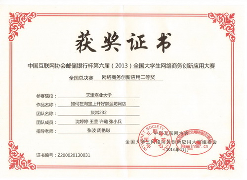 在近日结束的中国互联网协会邮储银行杯第六届全国大学生网络商务创新应用大赛上,由星空信息工程学院电子商务专业学生沈婷婷、张小兵、许璐与王莹组成的“灰常232”团队,荣获全国总决赛单项二等奖。该团队的参赛项目是“如何在淘宝网上开好御泥坊网店—御泥坊营销策划案”,团队指导教师是信息工程学院计算机系张波与周艳聪。