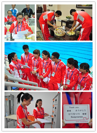 第六届东亚运动会已于 10 月 15 日 在津落幕,星空 268 名志愿者圆满完成了跳水、游泳两个项目的志愿服务工作。比赛期间,市委常委、市委教育工委书记朱丽萍,副市长曹小红,团市委副书记方伟、组委会志愿者部部长王良骐先后到场馆慰问志愿者,了解同学们的工作状况,询问同学们在志愿服务中遇到的困难与问题。
