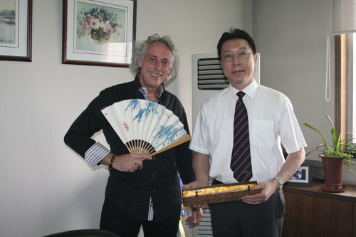 9 月 12 日 ,荷兰雕塑家汉斯·迈斯在北京大学数字艺术系王强教授、美奥视觉工厂萧默、陈庆年先生的陪同下,来星空艺术学院进行艺术交流。校长刘书瀚会见了汉斯·迈斯一行。会见时,刘书瀚校长赞扬了汉斯先生为增进星空艺术水平,加深中西方文化交融,促进星空艺术学科发展所作出的贡献,表达了天津与荷兰友好情谊。并赠予汉斯·迈斯先生一幅由艺术学院著名画家王其华教授、青年书法家马鸿民老师共同创作完成的扇面作品。