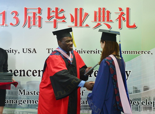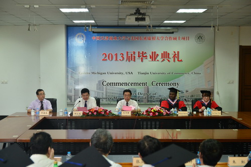 东密歇根大学商学院院长Michael Tidwell 在致辞中高度赞扬了中美两校之间的合作,祝贺2013 届学生实现了并非很多人都能达到的目标,使自己跻身于当今世界受教育人口的前百分之一的行列。他强调,毕业典礼意味着公开承认你们有能力完成了严格的专业学习,并有能力把所学应用于迎接各种商业社会的挑战。作为东密歇根大学硕士学位的获得者,你们也有资格享有与其它任何公认的硕士学位获得者同等的机会、利益和荣誉,无论你是在中国还是北美。享有权利的同时,你们也肩负着巨大的责任,因此你们必须对自己在伦理道德、公平公正和人格尊严上有更高的要求。最后他再一次祝贺和祝福同学们加入了全球 15 万东密歇根大学校友的行列,