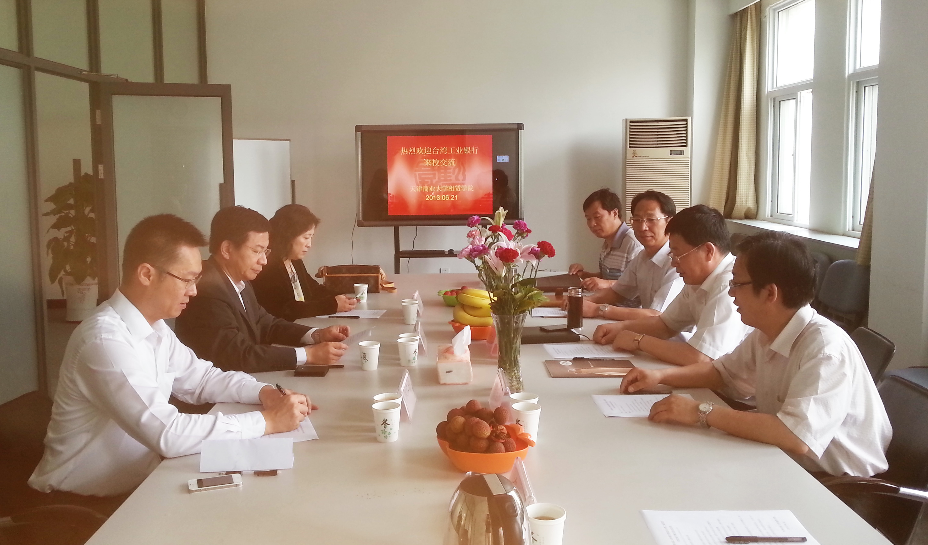 6 月21 日上午,台湾工业银行首席代表张水旺、副代表林仁彬、天津租赁行业协会副秘书长徐景怡一行来校进行合作交流,副校长邱立成在经济研究所二楼会议室与代表团进行了会见座谈,研究生部主任张立毅、经济学院副院长王常柏、租赁学院常务副院长王树春陪同参加。