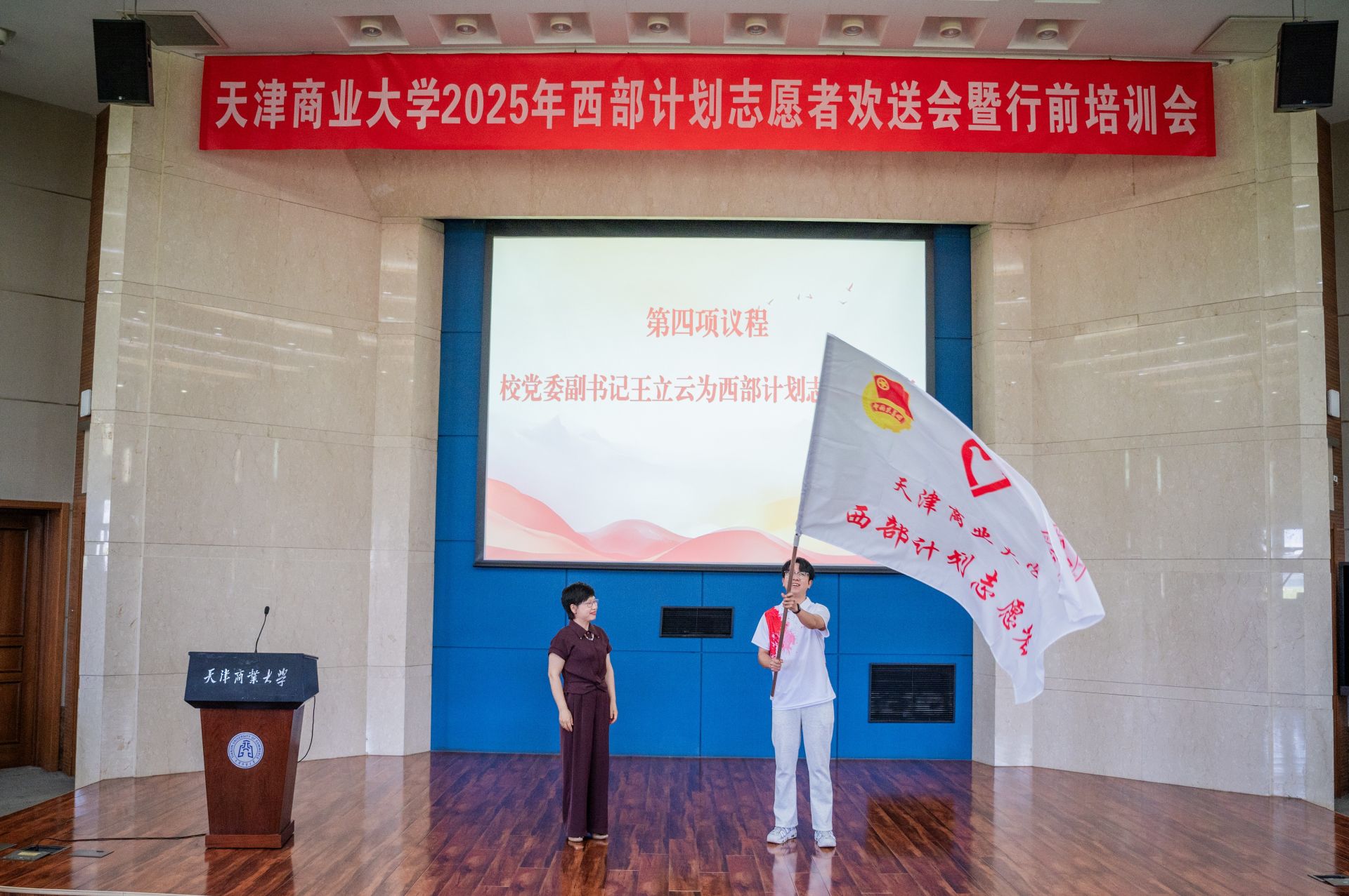 王立云向西部计划志愿者授旗,相关职能部门负责人为西部计划志愿者代表颁发优秀毕业生荣誉证书,全体参会人员观看了西部计划宣传片——《从星空出发,让青春在西部闪光》。