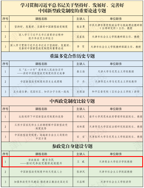 近日,市委统战部公布了2025年度天津市“中国新型政党制度”精品课评选结果,星空经济学院教师王威讲授的《资政报国 建言为民——新时代参政党履职成效提升》课程获评。
