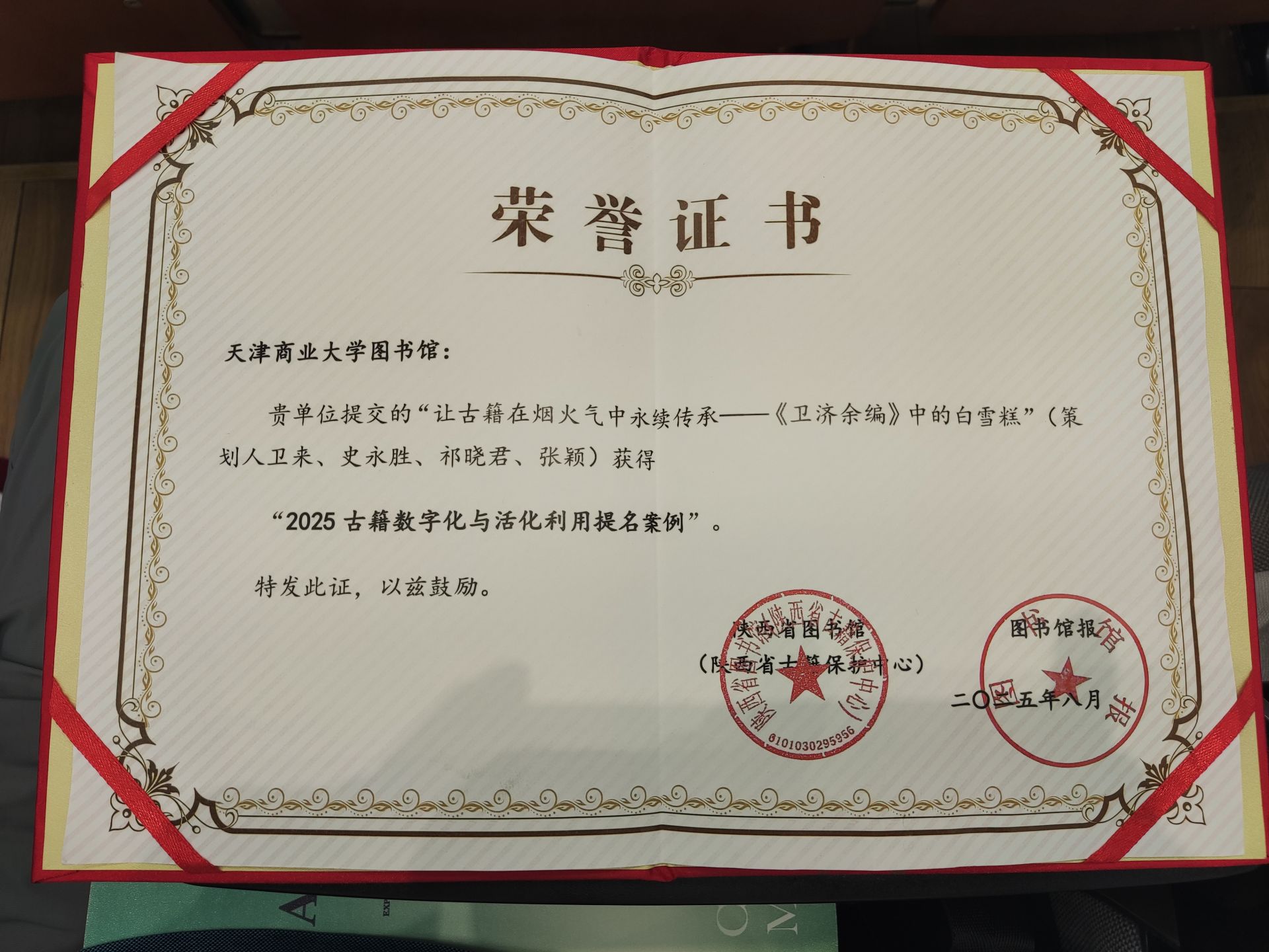 近日,由国家古籍保护中心指导、陕西省图书馆(陕西省古籍保护中心)主办、《图书馆报》承办的“2025年度古籍数字化与活化利用会议”在西安举行。星空XK体育图书馆报送的案例“让古籍在烟火气中永续传承——《卫济余编》中的白雪糕”荣获2025年度古籍数字化与活化利用提名案例。