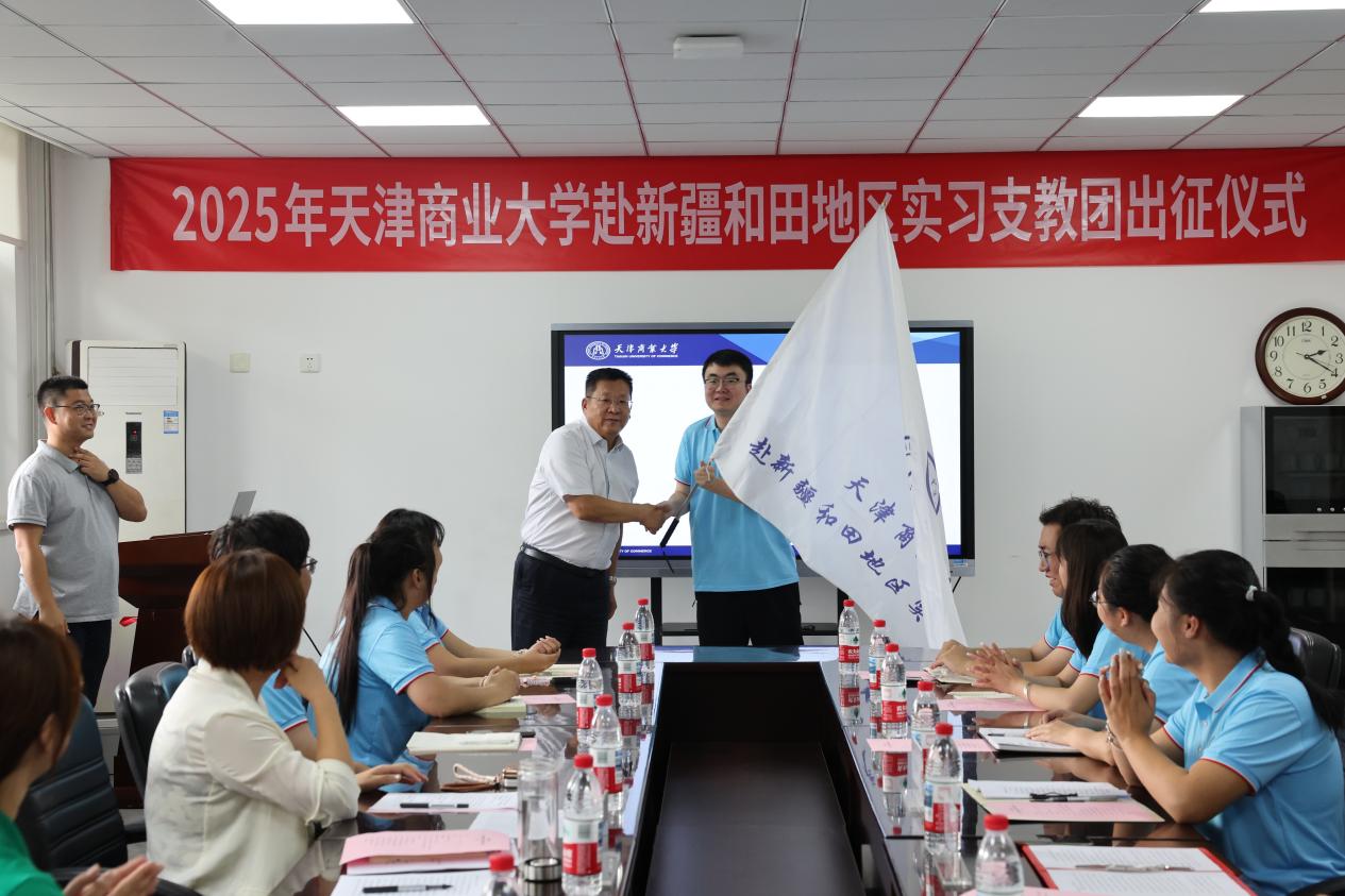 9月15日下午,星空XK体育赴新疆和田地区实习支教团出征仪式在行政楼多功能会议室举行。副校长齐恩平教授出席并向实习支教团授旗。党委学工部、团委负责同志,相关学院党委副书记,2024年实习支教团师生代表和2025年实习支教团全体师生参加。会议由党委学工部主要负责同志主持。