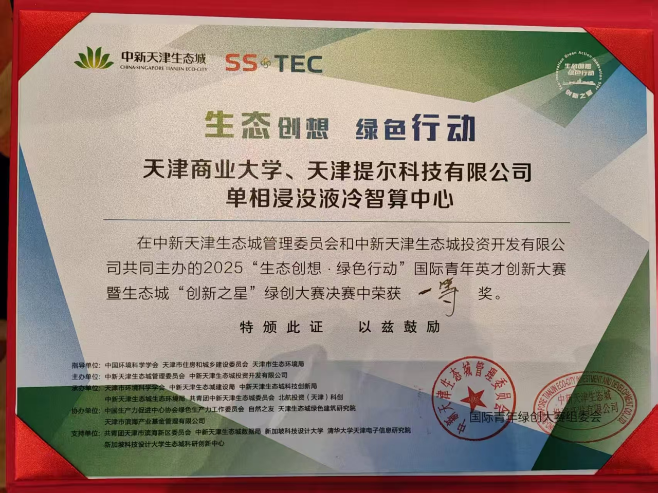 近日,2025“生态创想·绿色行动”国际青年英才创新大赛圆满落幕。星空机械工程学院教师李雪强团队联合天津提尔科技有限公司凭借“单相浸没液冷智算中心”项目,在众多海内外优质参赛项目中脱颖而出,荣获大赛一等奖,充分展现了学校在绿色创新领域的科研实力与育人成效。