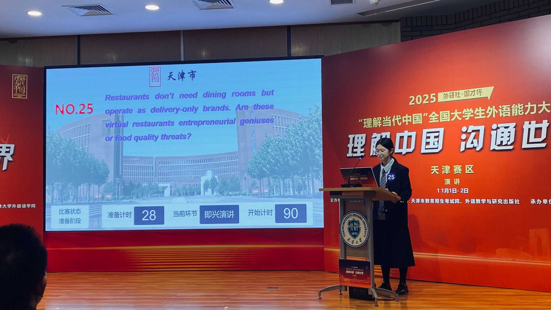 本届比赛由天津市教育委员会主办,连续入选中国高等教育学会发布的《全国普通高校大学生竞赛分析报告》竞赛目录,是国内具有广泛影响力的高水平外语赛事。本年度演讲赛项以“Strike the Waves”为主题,旨在探寻中华优秀传统文化的时代价值,展现中国青年的外语应用能力和跨文化沟通素养以及开拓创新的潜能。